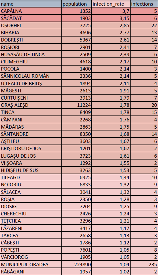 Comuna Căpâlna a scăzut duminică sub pragul de 4‰. În acest moment, toate localitățile din Bihor sunt situate sub pragul de 4 infectări la 1.000 locuitori. Localitatea Săcădat înregistrează rata de infectare de 3.15‰, în timp ce municipiul Oradea a ajuns la 1.04‰, cu 235 cazuri active.