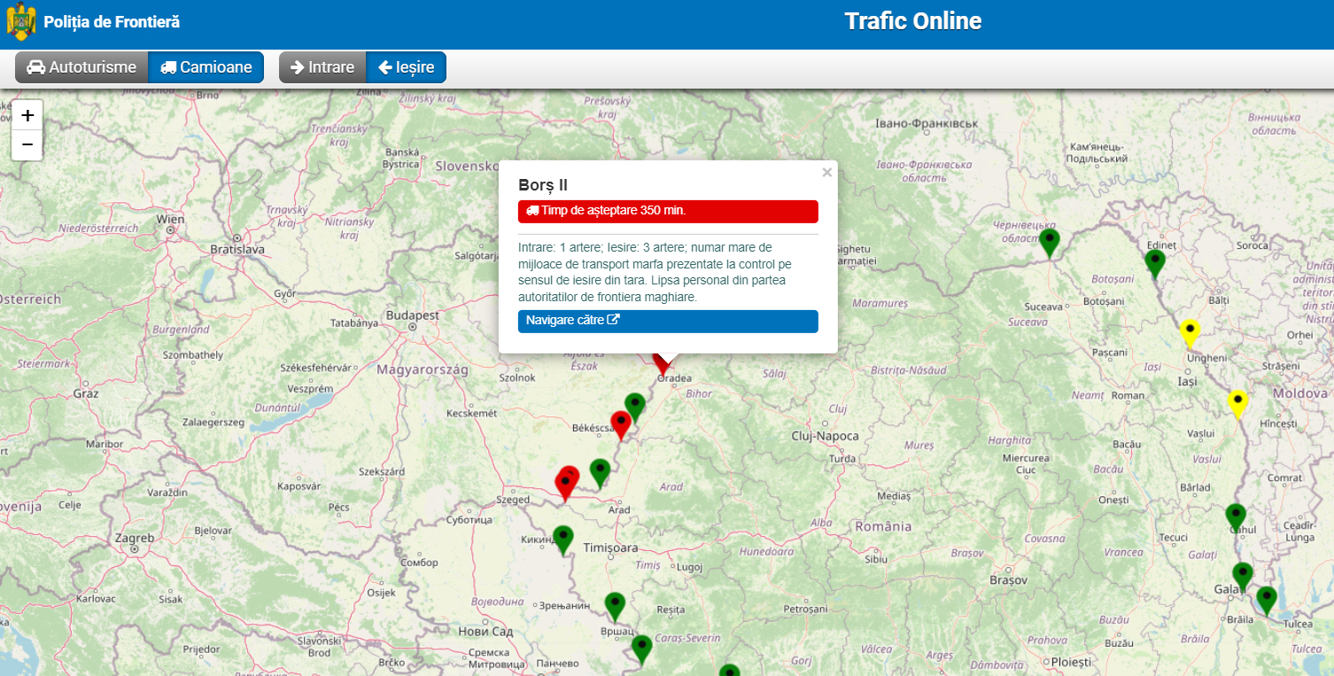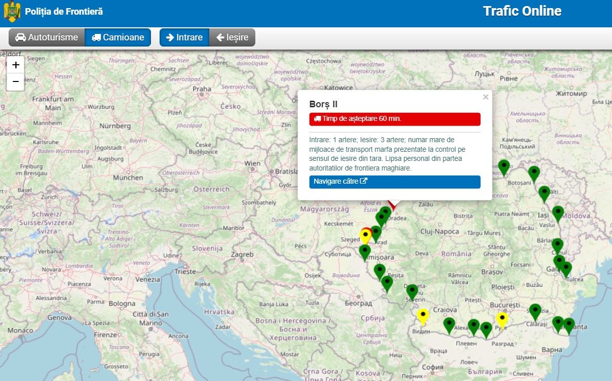 De asemenea, recomandăm consultarea aplicaţiei Trafic on-line care este disponibilă pe pagina de internet www.politiadefrontiera.ro . Această aplicaţie on-line prezintă o medie a timpilor de aşteptare în punctele rutiere de trecere a frontierei pentru anumite intervale de timp.