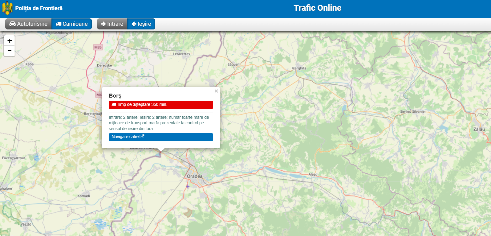„În urma restricţiilor de circulație din perioada 11-15.03.2022, de pe teritoriul Ungariei, când autovehiculele de transport cu o capacitate mai mare de 7,5 tone nu au circulat pe teritoriul statului vecin, dar şi din cauza prezentării unui număr mare de automarfare pentru a ieşi din ţară într-un timp foarte scurt, la această oră în punctele de trecere a frontierei de la granița comună se înregistrează timpi de aşteptare ridicaţi pe sensul de ieşire din ţară pe arterele destinate acestor autovehicule. A fost mărit numărul arterelor de control pentru automarfare pe sensul de ieşire din ţară, atât în P.T.F. Borş II (se lucrează pe 4 artere) cât şi în P.T.F. Nădlac II (se lucrează pe 6 artere), dar şi în P.T.F. Vărşand (se lucrează pe 3 artere), P.T.F. Borş (se lucrează pe 2 artere)., a transmis purtătorul de cuvânt al ITPF Oradea, comisarul-șef de poliție, Laura Bondar.