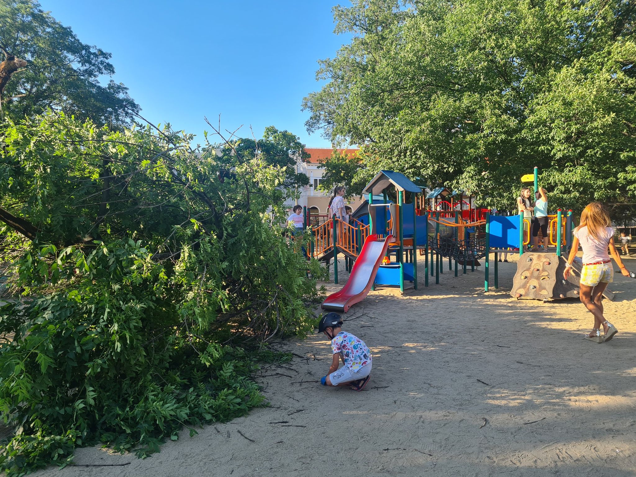 Copacul a căzut în fața unor bănci pe care se aflau oameni. În cădere, o creangă a atins ușor un copil care era pe tobogan, însă fără să-l rănească.