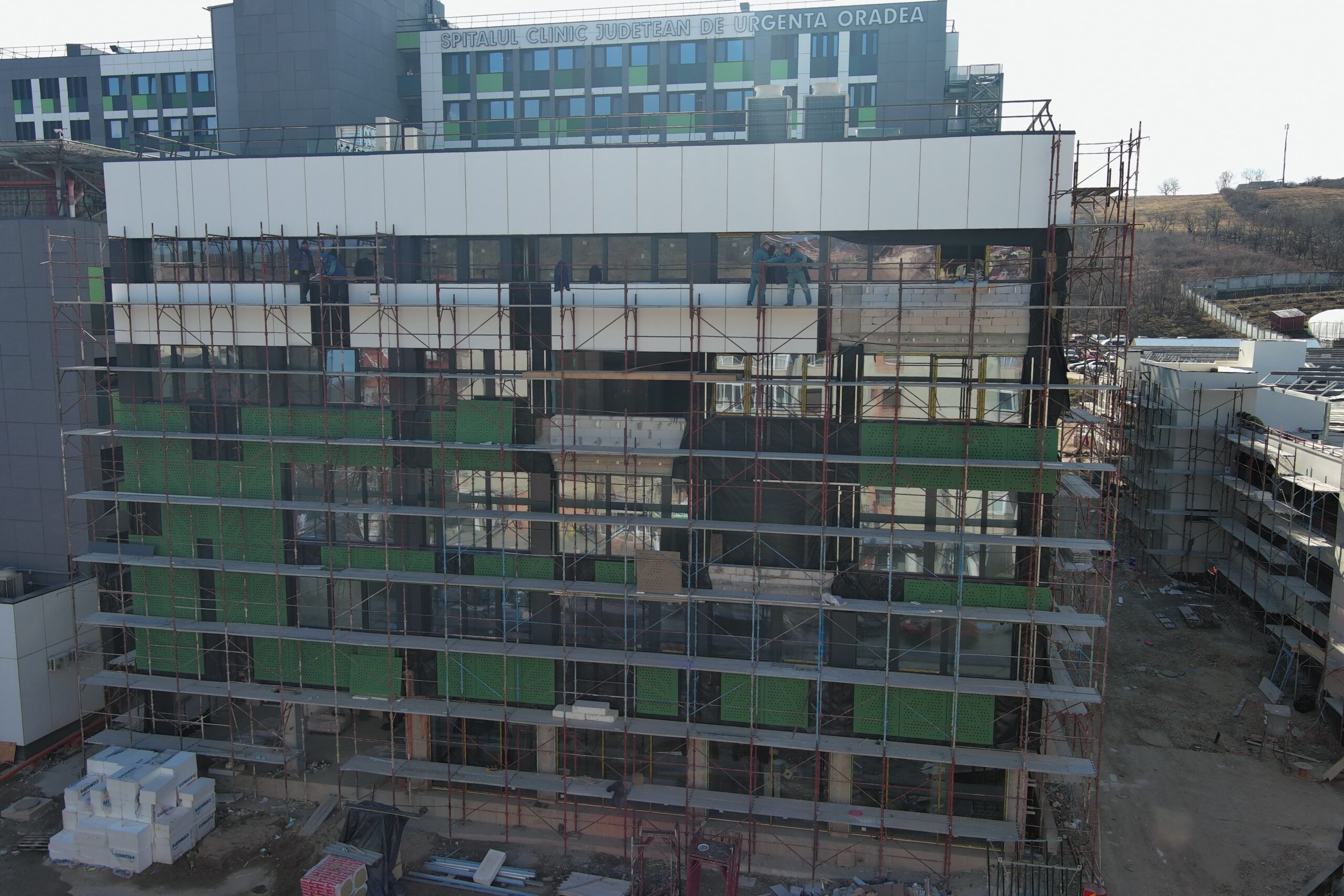„În acest moment, ne concentrăm pe finisaje, montarea tâmplăriei la interior, finalizarea pasarelelor de legătură cu spitalul și a celei care va face legătura cu parcarea supraetajată din imediata apropiere, reali-zarea sistemelor de gaze medicale și continuarea lucrărilor la fațada ventilată’’, precizează inginerul Tiberiu Bereczki, managerul de proiect.