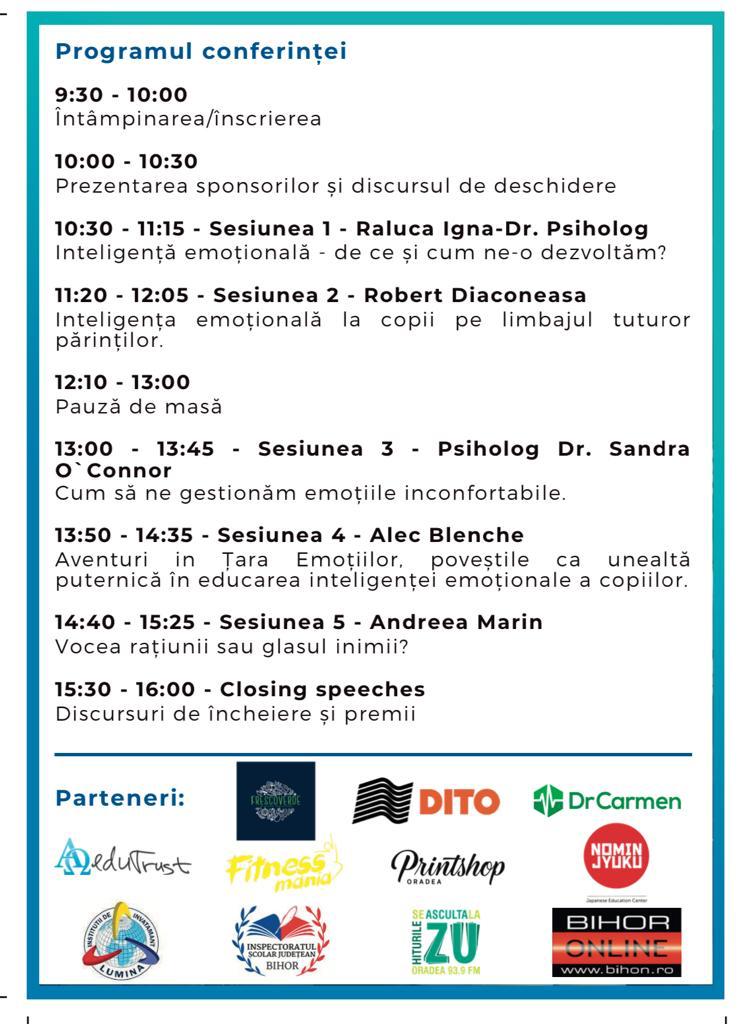Evenimentul desfășurat pe data de 20 mai este destinat părinților, profesorilor precum și celor care sunt interesați să afle mai multe despre Inteligența Emoțională. Printre speakeri acestei conferințe se numără activistul umanitar, moderator și producător de emisiuni de radio și televiziune, nimeni alta decât Andreea Marin, alături de prof. Psiholog Sandra O`Connor, Psiholog Raluca Igna, bloggerul Robert Diaconeasa cunoscut sub numele de Daddy Cool, autorul de cărți pentru copii Alec Blenche și nu în ultimul rând de orădeanca Beatrice Pantea care va fi moderatoarea evenimentului.