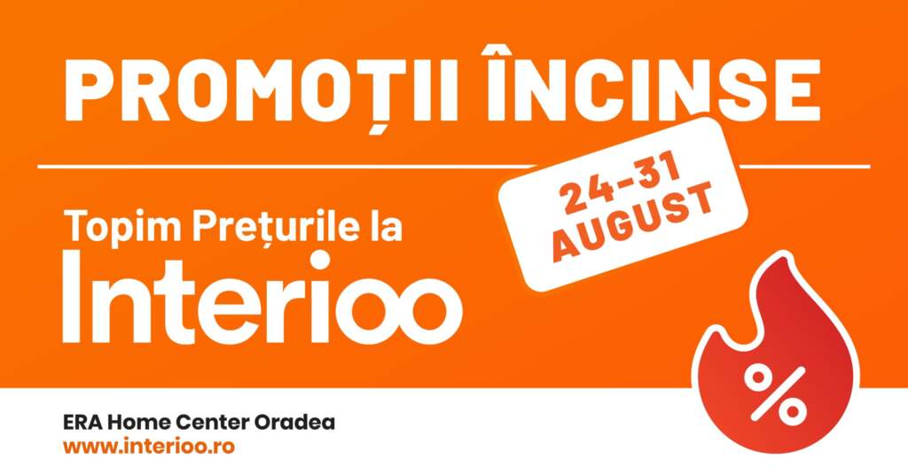 Nu lăsa aceste oferte să treacă pe lângă tine! Vino la Interioo între 24 și 31 august și descoperă colecția noastră selectă de produse la prețuri reduse. Transformă-ți casa într-un spațiu de poveste cu produse de calitate, iar economiile pe care le vei face vor fi pe măsură. Așteptăm cu drag vizita ta la Interioo, în Era Home Center Oradea!