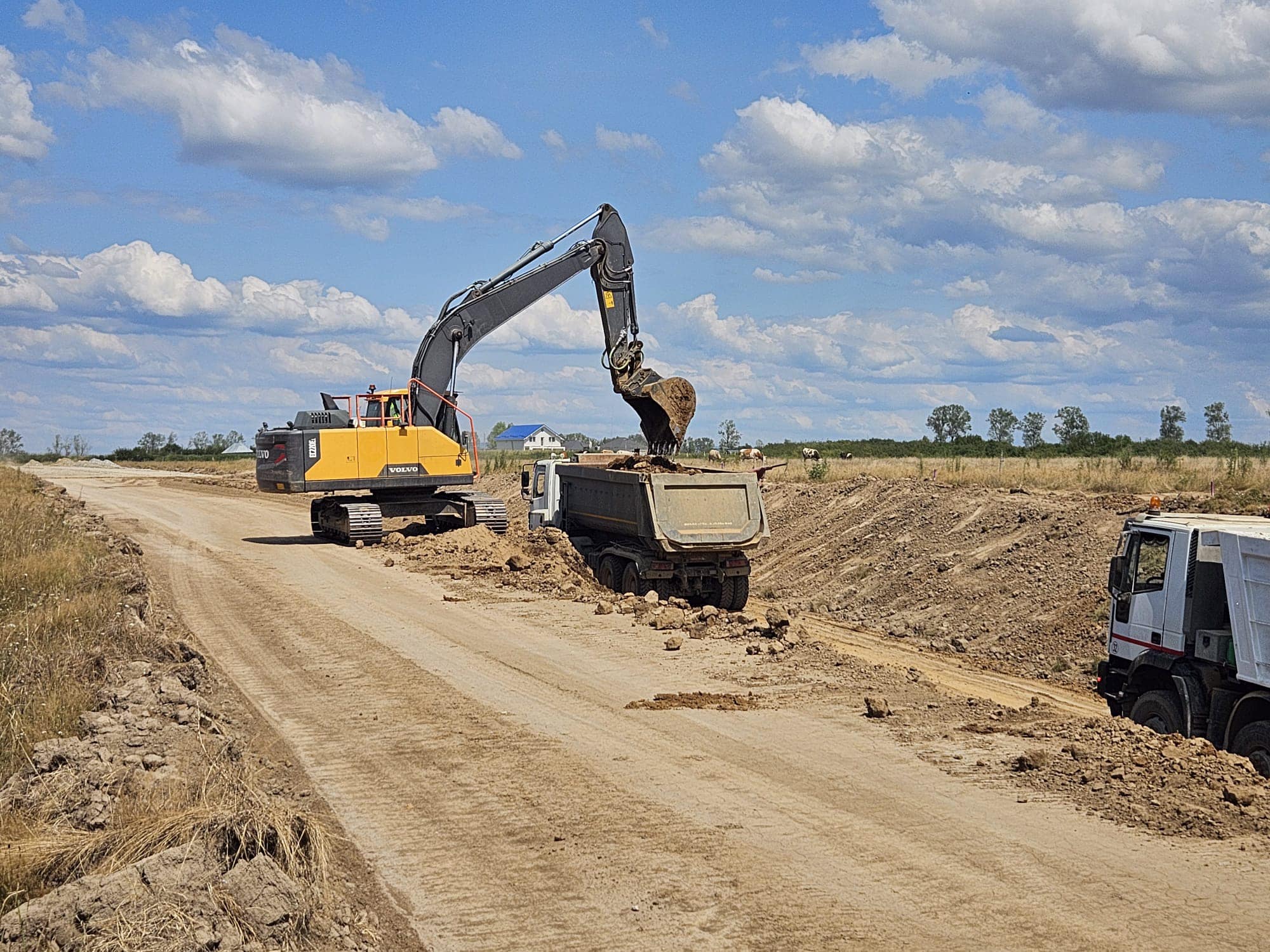 De asemenea, s-a consolidat terenul și s-a așternut primul strat de balast, după ce s-a excavat stratul de pământ vegetal. Lucrătorii execută podețele de pe traseu și profilează șanțurile.