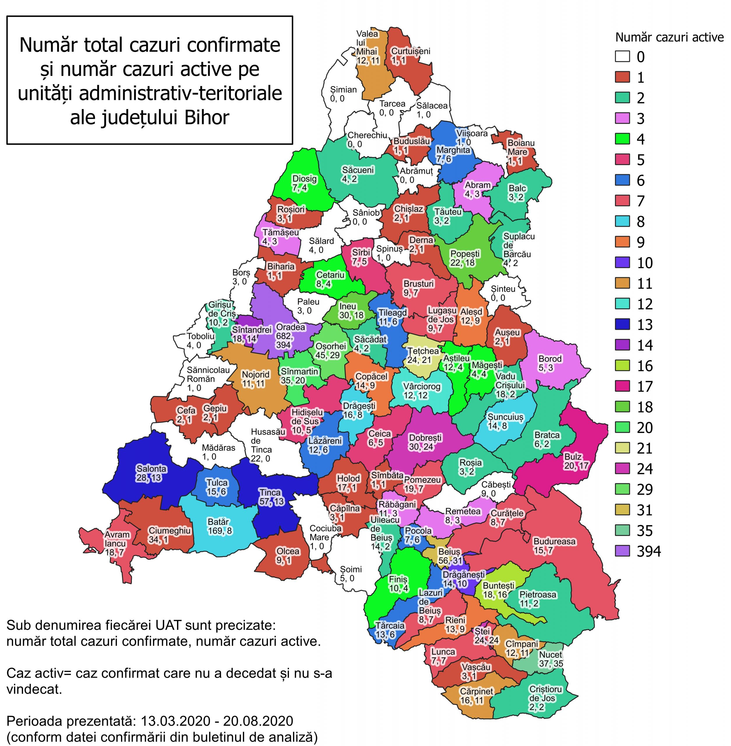 Potrivit Dr. Rahotă, cele mai multe cazuri se înregistrează în: Oradea 390, Nucet 35, Beiuș 32, Oșorhei 29, Dobrești 24, Ștei 24, Țețchea 21, Sânmartin 20, Popești 18, Ineu, 15, Sântandrei 14. Un procent de 81% din UAT-uri au cazuri pozitive de coronavirus.