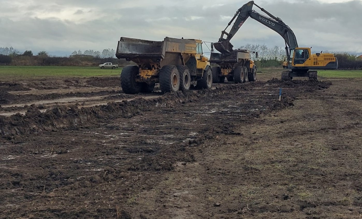 Constructorii decopertează stratul vegetal și pregătesc așternerea stratului de balast. În paralel, se definitivează soluțiile tehnice pentru relocarea utilităților.