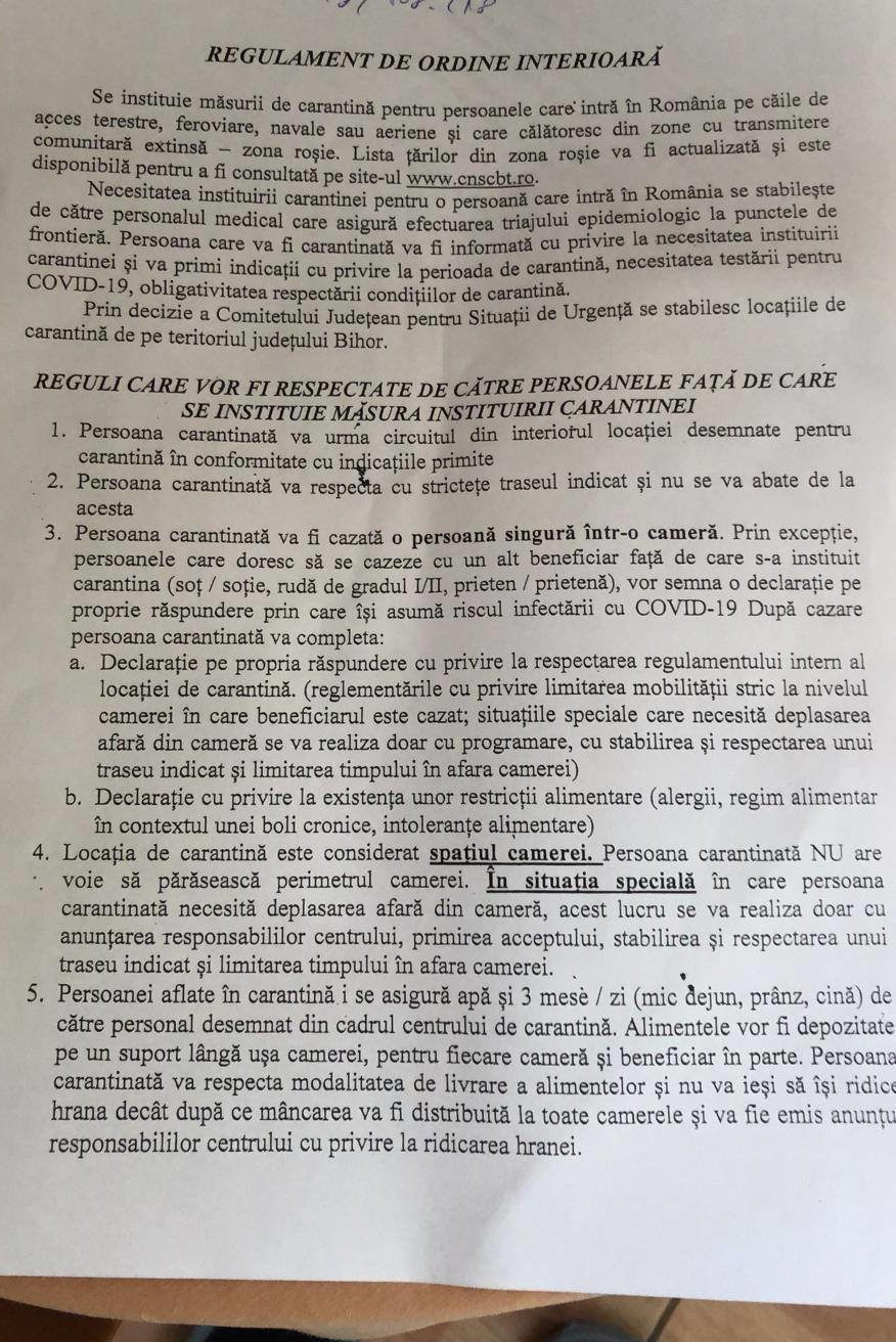 Potrivit regulamentului de ordine interioară pe care l-a văzut și bărbatul care ne-a sesizat condițiile periculoase și improprii de locuit în carantină, într-o singură cameră are voie, într-adevăr, să stea doar o singură persoană (vezi foto atașată), singurele exceptate fiind rudele.
