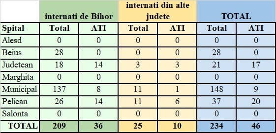 Pentru acuratețe, atașăm tabelul cu situația internărilor de duminică dimineață, în spitalele din Oradea și județ atât la secțiile Covid cât și la secțiile ATI-Covid.