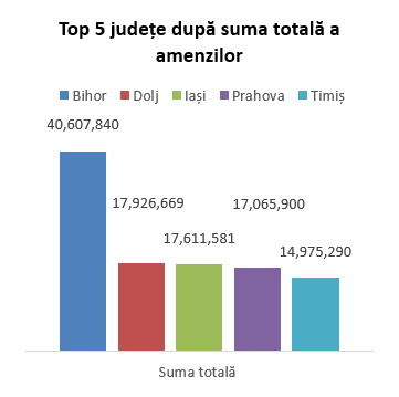 Judetul Bihor a aplicat cele mai mari amenzi si se remarca detasat cu suma totala de 40.607.840 de lei, dublu fata de judetul imediat urmator, Dolj, care a aplicat amenzi in valoare de 17.926.669 de lei.