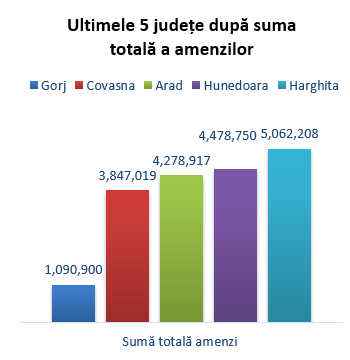 La polul opus, judetele care au aplicat cel mai mic numar de amenzi sunt Gorj, Covasna, Mehedinti, Tulcea si Harghita. Comparativ, în Bihor s-au dat de amenzi în valoare de 40 de milioane de lei, iar în Gorj, de un milion de lei, un număr de 40 de ori mai mare.