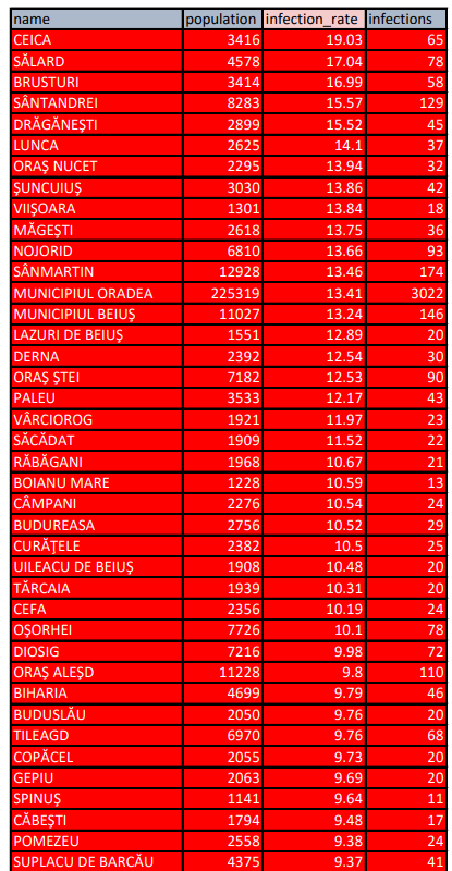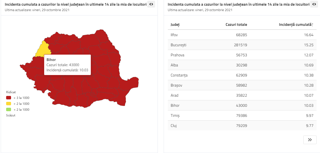 Potrivit datelor aferente pentru ziua de vineri, 29 octombrie, Bihorul se poziționa pe locul 8 în topul celor mai mari incidențe din țară, depășind Timișul și Clujul.