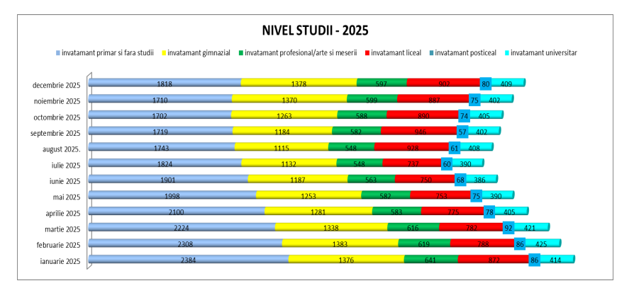 La finalul anului erau înregistrați 5.184 de șomeri, cu 442 mai puțini decât în decembrie 2024. Cu toate acestea, media lunară a șomerilor a crescut de la 4.737 persoane în 2024 la 5.126 în 2025, un semnal că piața muncii a fost mai tensionată pe parcursul anului, chiar dacă finalul a adus o scădere.