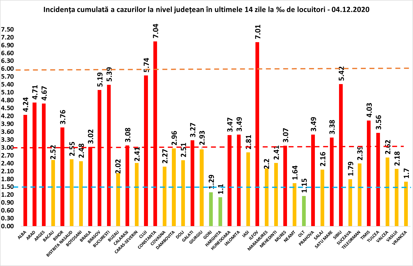 Coeficientul infectărilor cumulate la 14 zile, raportate la 1.000 de locuitori este calculat de către Direcțiile de Sănătate Publică, la nivelul Municipiului București și al județelor. Mai jos aveți graficul realizat în baza raportărilor primite de CNCCI de la Direcțiile de Sănătate Publică: