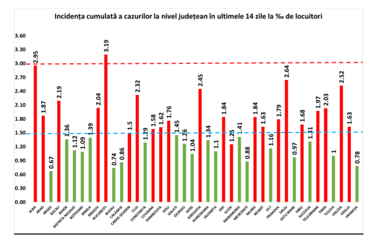 Coeficientul infectărilor cumulate la 14 zile, raportate la 1.000 de locuitori, calculat de către Direcțiile de Sănătate Publică, la nivelul Municipiului București și al județelor este următorul: