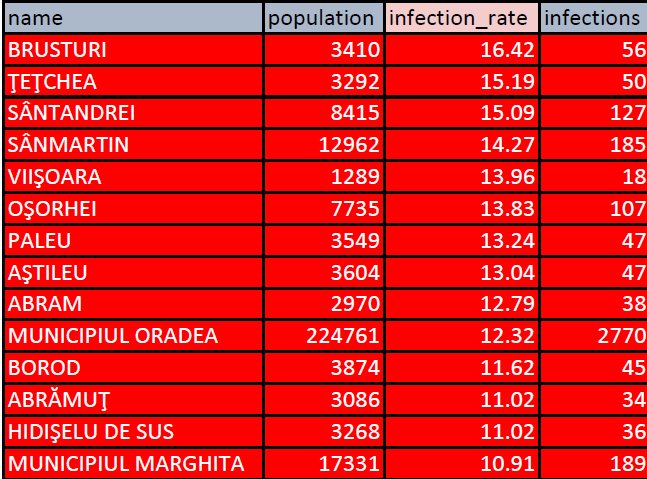 În prezent 14 localități depășesc pragul de infectare de 10 cazuri la 1.000 locuitori. Oradea înregistrează rata de infectare de 12.32‰, cu 2.770 cazuri active. Topul este condus de localitatea Brusturi, cu 16.42‰ și 56 infectări active.