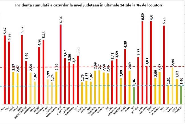 Coeficientul infectărilor cumulate la 14 zile, raportate la 1.000 de locuitori este calculat de către Direcțiile de Sănătate Publică, la nivelul Municipiului București și al județelor. Mai jos aveți graficul realizat în baza raportărilor primite de CNCCI de la Direcțiile de Sănătate Publică: