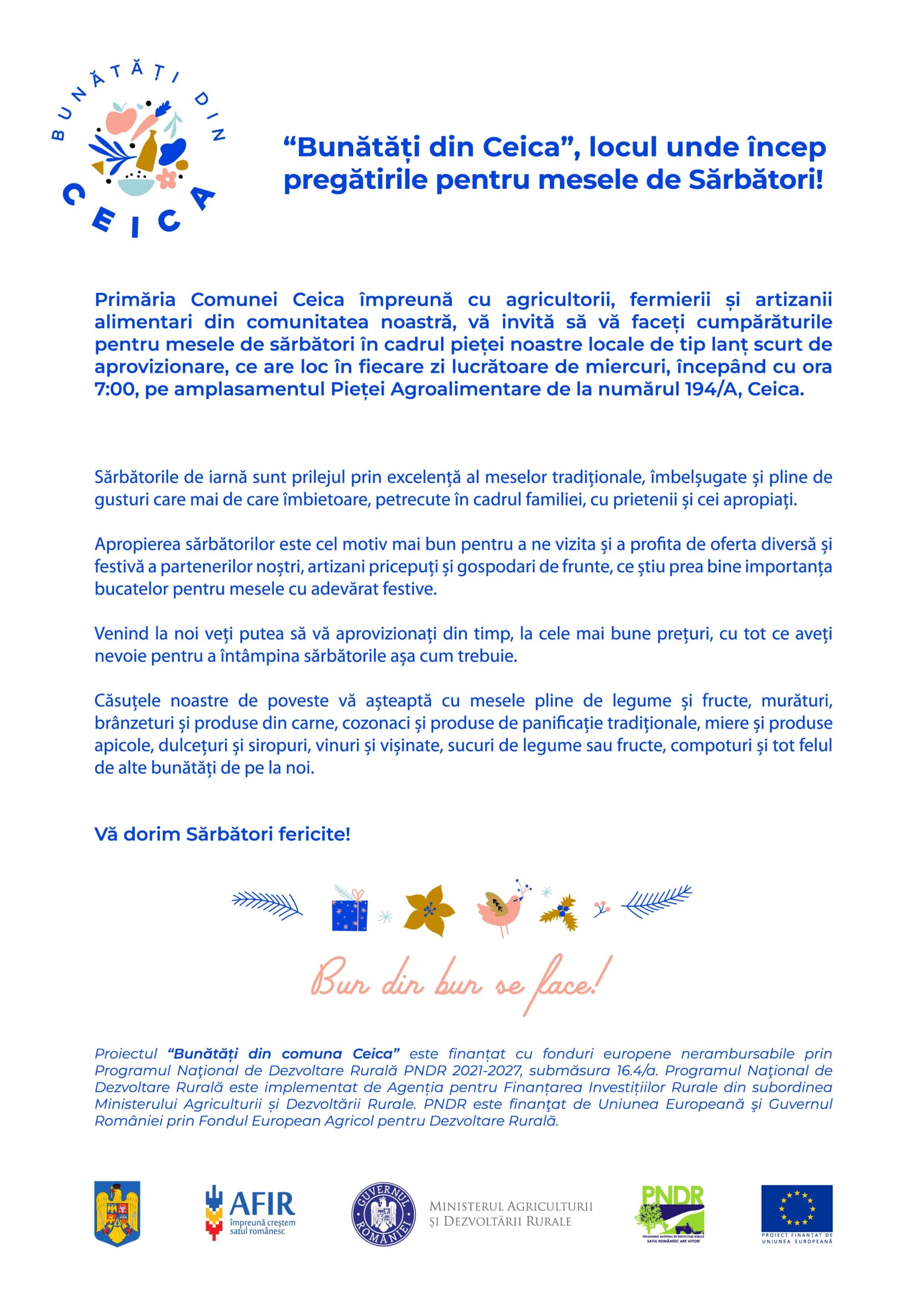 Proiectul “Bunătăți din comuna Ceica” este finanțat cu fonduri europene nerambursabile prin Programul Naţional de Dezvoltare Rurală PNDR 2021-2027, submăsura 16.4/a. Programul Naţional de Dezvoltare Rurală este implementat de Agenția pentru Finanțarea Investițiilor Rurale din subordinea Ministerului Agriculturii și Dezvoltării Rurale. PNDR este finanţat de Uniunea Europeană şi Guvernul României prin Fondul European Agricol pentru Dezvoltare Rurală.