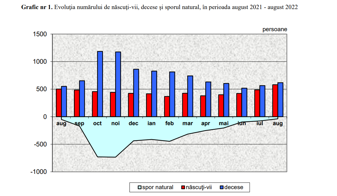 Tot în luna august 2022 s-au înregistrat 617 persoane decedate, în creștere cu 53 decese faţă de luna precedentă şi în creștere cu 66 faţă de luna august 2021. Sporul natural din luna august 2022, calculat ca diferenţă între numărul de născuţi-vii şi decesele înregistrate, a fost de 37 persoane.