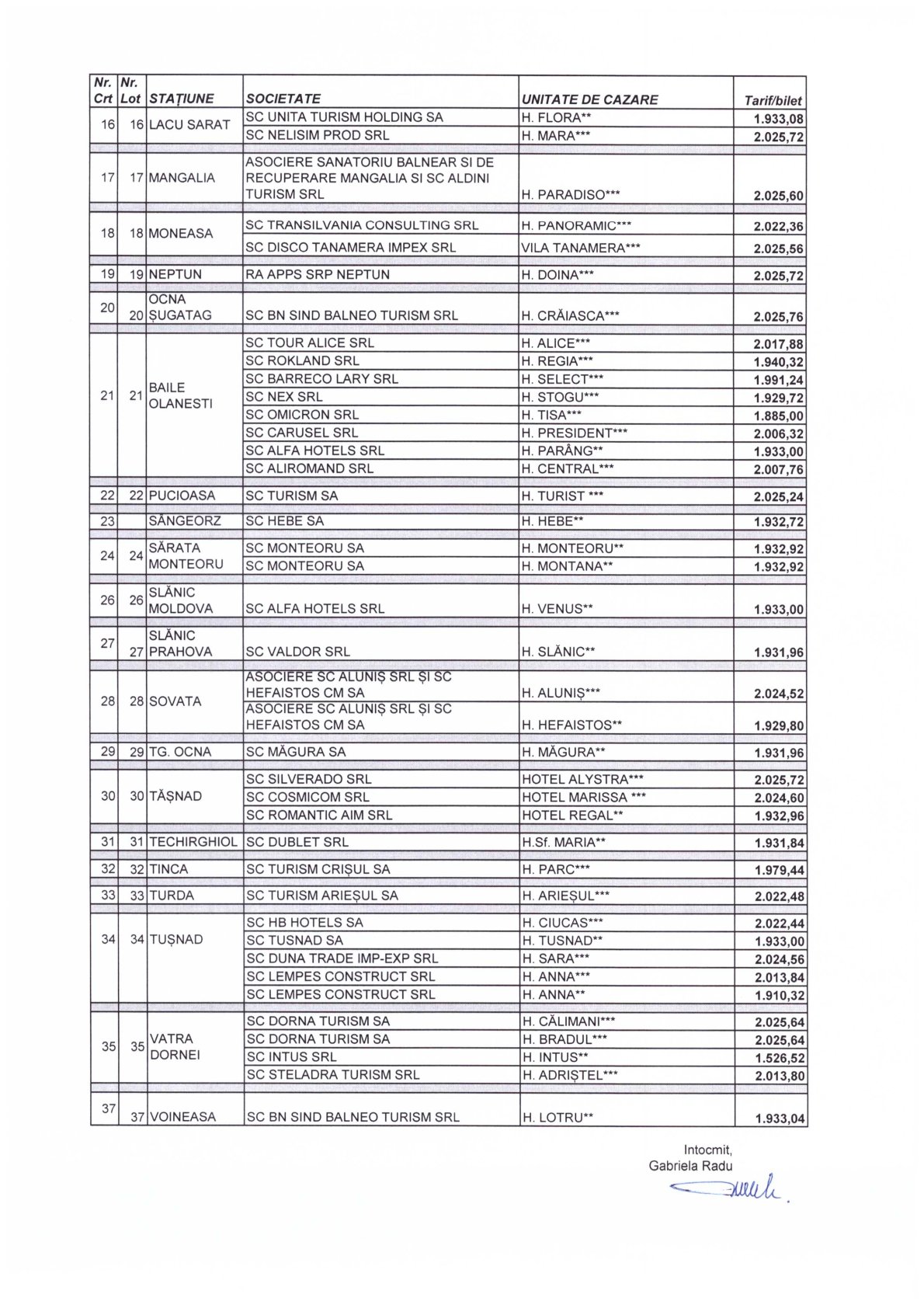 Biletele sunt pentru următoarele stațiuni: Sovata – două bilete, Băile Herculane – 17 bilete, Buziaș – 12 bilete, Covasna – 12 bilete, Băile Felix – 49 de bilete, Geoagiu Băi -două bilete, Băile 1 Mai – 58 de bilete, Moneasa – 14 bilete, Mangalia -șase bilete, Ocna Șugatag – două bilete, Tinca – 24 de bilete, Turda – două bilete, Vatra Dornei – patru bilete, Căciulata – opt bilete.