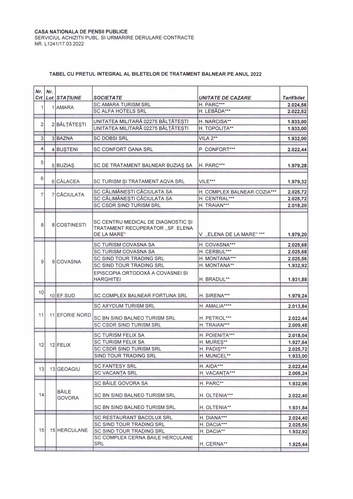 Biletele sunt pentru următoarele stațiuni: Sovata – două bilete, Băile Herculane – 17 bilete, Buziaș – 12 bilete, Covasna – 12 bilete, Băile Felix – 49 de bilete, Geoagiu Băi -două bilete, Băile 1 Mai – 58 de bilete, Moneasa – 14 bilete, Mangalia -șase bilete, Ocna Șugatag – două bilete, Tinca – 24 de bilete, Turda – două bilete, Vatra Dornei – patru bilete, Căciulata – opt bilete.