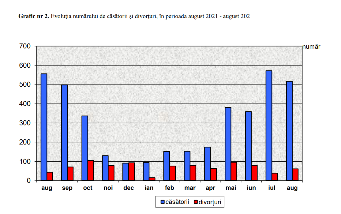 Comparativ cu luna august a anului 2021, numărul căsătoriilor a scăzut cu 39. În luna august 2022 instanţele judecătoreşti au pronunţat definitiv 61 divorţuri, în creștere cu 22 divorţuri faţă de numărul de divorţuri din luna precedentă şi în creștere cu 17 faţă de numărul de divorţuri din luna august 2021.