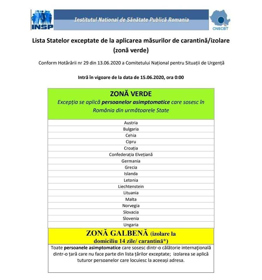 „Excepție fac cetățenii care vin din state ce nu se află pe lista aprobată de CNSU și care petrec în țările incluse pe listă o perioadă de 14 zile sau mai mare, înainte de a intra în România,potrivit articolului 1, punctul 2 din Hotărârea numărul 28 a CNSU. Reamintim că statele pentru care este introdusă măsura exceptării de la izolare, pentru persoanele asimptomatice care vin în România, sunt: Austria, Bulgaria, Cehia, Cipru, Croația, Confederația Elvețiană, Germania, Grecia, Islanda, Letonia, Liechtenstein, Lituania, Malta, Norvegia, Slovacia, Slovenia și Ungaria”, se arată în informarea GCS.