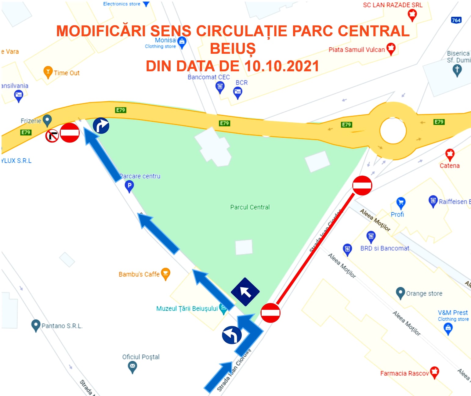 Conform comunicatului Primăriei Beiuș, „se va bloca circulația prin fața Aleei Moților; sensul de mers pe strada dintre muzeu și parc – de la muzeu la intersecția cu DN 76 se schimbă în sens unic spre DN 76. Pentru a evita neplăcerile cauzate de schimbarea condițiilor de trafic, rugăm toți cetățenii, pietonii și conducătorii auto să respecte noile reguli și să circule cu atenție sporită!”, e mesajul autorităților din Beiuș.