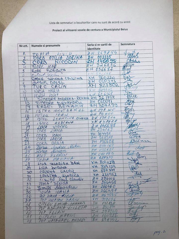 „În PUZ-ul orașului, cartierul apare ca zonă rezidențială, sunt construite case noi, cu proiecte conform acestui PUZ, terenurile sunt parcelate pentru locuințe, iar linia de distribuție electrică a fost recent dată în funcțiune. Casele recent construite sunt la o distanță mică față de stradă, de 3 m. Strada are o lățime de 9 m din care trebuie construite trotuare pe ambele părți. Dacă noua șosea va trece pe această stradă, noi proprietarii nu vom avea posibilitatea să ne scoatem mașina din curte, fiind expuși pericolului real de accident, casele se vor deteriora într-o perioadă scurtă de timp, legătura cu orașul va fi puternic afectată, iar stresul pshihic va fi maxim pentru toți locuitorii. Cerem ca proiectul viitoarei șosele de centură să ocolească această zonă de case noi și să nu deranjze buna desfășurare a activităților locuitorilor acestei zone. Având în vedere că această zonă e limitată de terenuri agricole, considerăm că ar putea trece pe acolo șoseaua de centură”, se arată în solicitarea depusă de zeci de familii de pe cele patru străzi din cartierul de case din Beiuș.
