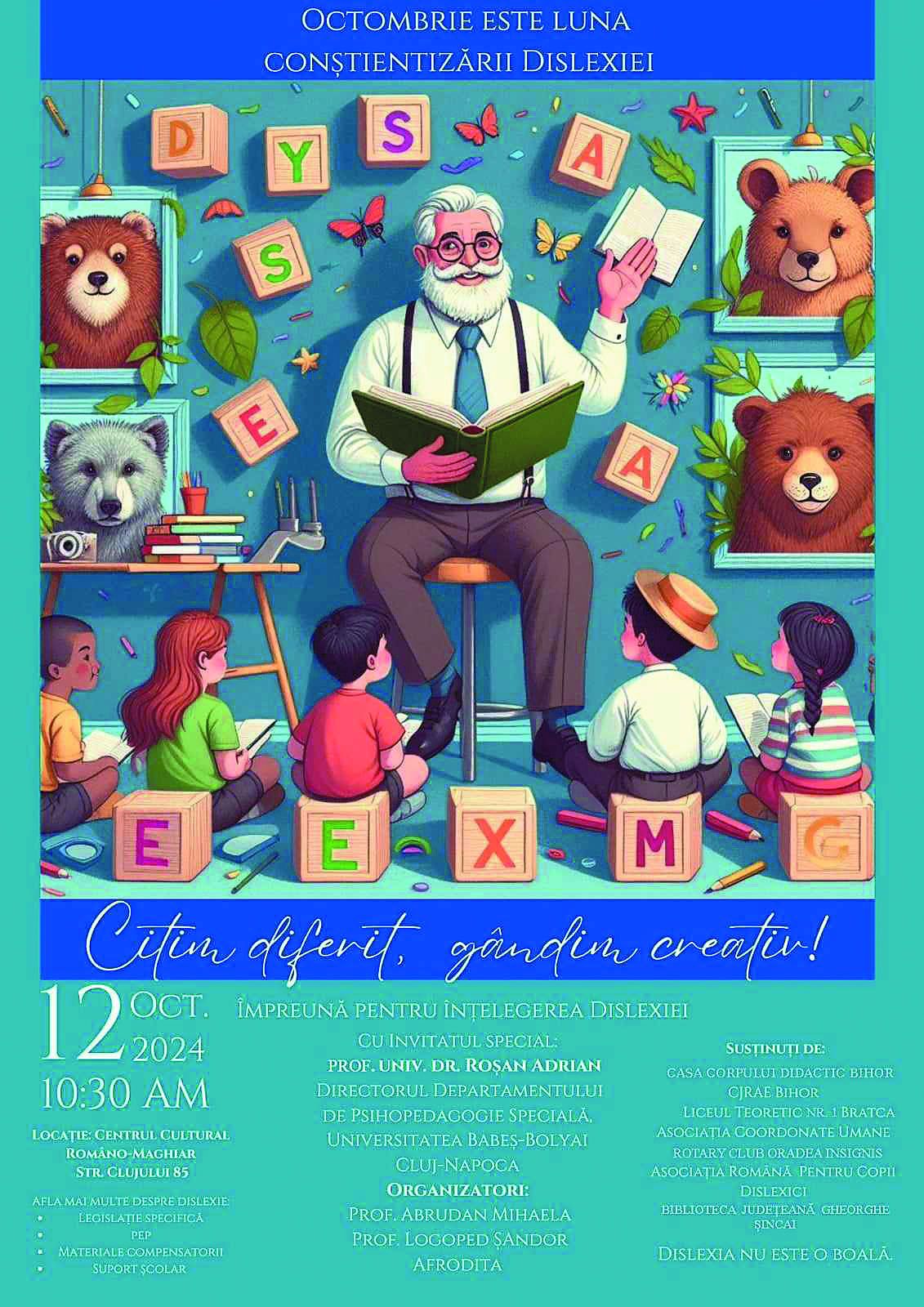 Evenimentul, născut din nevoia conștientizării și cunoașterii corecte a dislexiei, va avea loc la data de 12 octombrie, ora 10:30, la Centrul Cultural Româno-Maghiar, situat pe strada Clujului nr. 85.