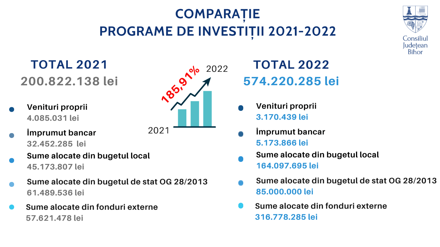 Suma prevăzută pentru investiții în acest an, de Consiliul Județean Bihor, reprezintă 65% din buget, în creștere față de 2021, când suma alocată investițiilor a fost de aproximativ 50% din totalul veniturilor. Asta înseamnă o creștere a alocărilor pentru dezvoltare cu 186% față de anul trecut.