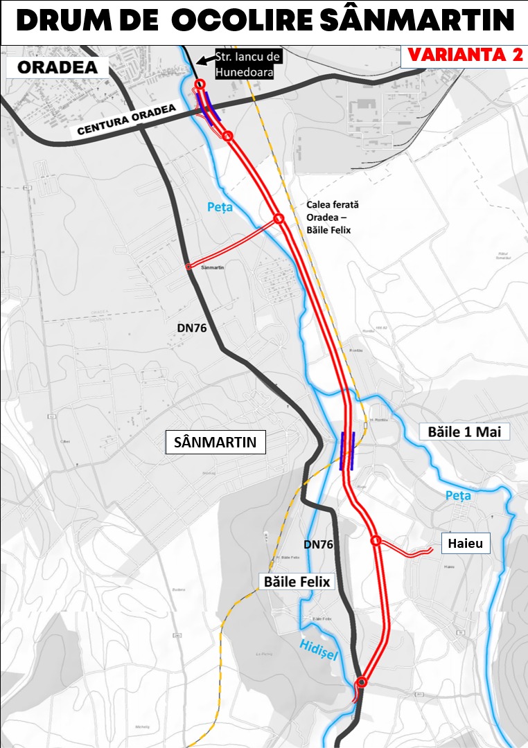 A doua variantă de traseu are o lungime de 5,76 kilometri și se studiază în prezent în cadrul Studiului de Fezabilitate contractat cu Consiliul Județean Bihor. “Traseul pornește de pe strada Iancu de Hunedoara printr-un pasaj suprateran peste Centura Oradea, apoi merge de-a lungul cursului Pârâului Peța. Ruta continuă spre Băile 1 Mai. În această zonă va fi construit un alt pasaj suprateran peste drumul dintre Sânmartin și Băile 1 Mai și peste calea ferată Oradea – Sânmartin. Revenirea în Drumul Național 76 (DN76) se va face printr-un sens giratoriu, care ar urma să fie construit cu aproximativ 50 de metri înainte de a vira spre localitatea Cordău, la ieșire din Băile Felix spre Beiuș”, se mai arată în comunicat.