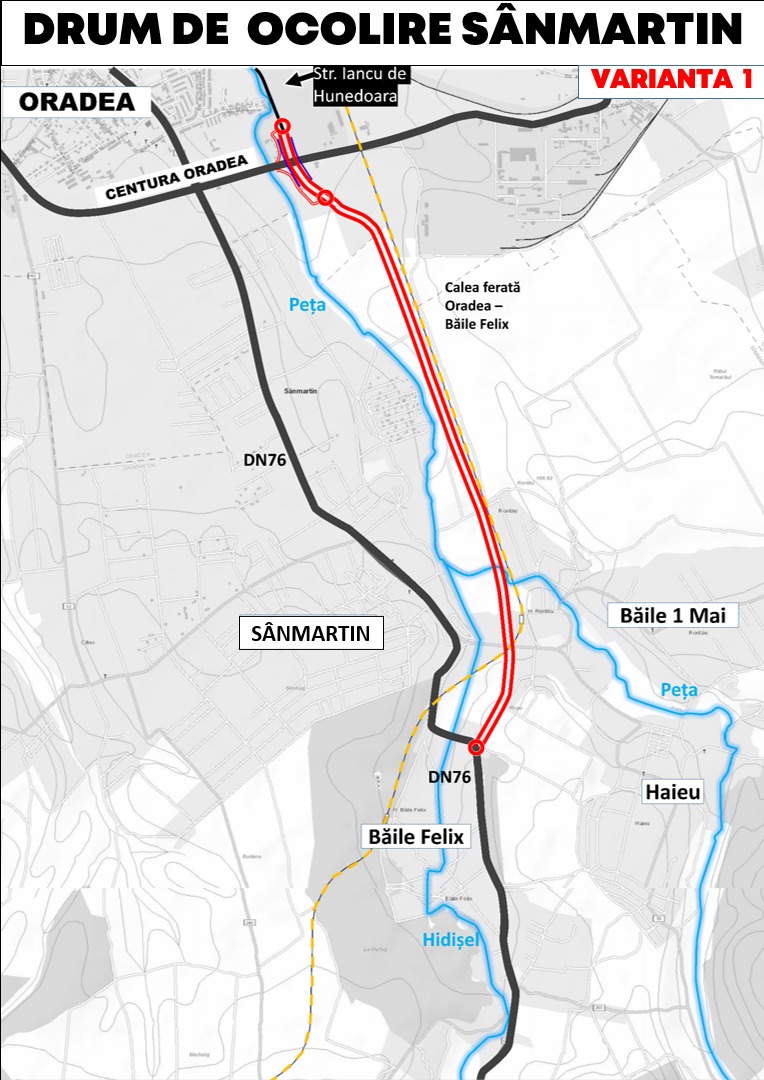 Prima variantă de traseu, cea scurtă, are o lungime de 4,05 kilometri și a fost analizată în anul 2015 în cadrul unui Studiu de Fezabilitate realizat de Zona Metropolitană Oradea. “Traseul se desprinde din centura Oradea, la girația de pe strada Iancu de Hunedoara, și continuă spre sud, pe partea stângă DN76, ocolind localitatea Sânmartin prin est, iar Băile 1 Mai prin vest. Capătul sudic al drumului de legatură se află în drumul național DN76 la kilometrul 176+392, la intrarea în Baile Felix dinspre Oradea, într-o intersecție giratorie propusă”, se arată într-un comunicat al CJ Bihor.