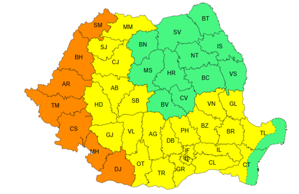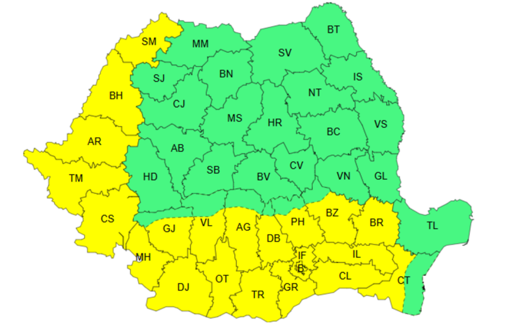 Începând de sâmbătă ora 12, și până duminică, 10 august, ora 10, Bihorul se va afla sub cod galben. Temperaturile maxime vor ajunge la 35–37°C, iar indicele temperatură-umezeală (ITU) va atinge sau va depăși pragul critic de 80 de unități. Noaptea va fi tropicală, cu minime între 18 și 22°C.