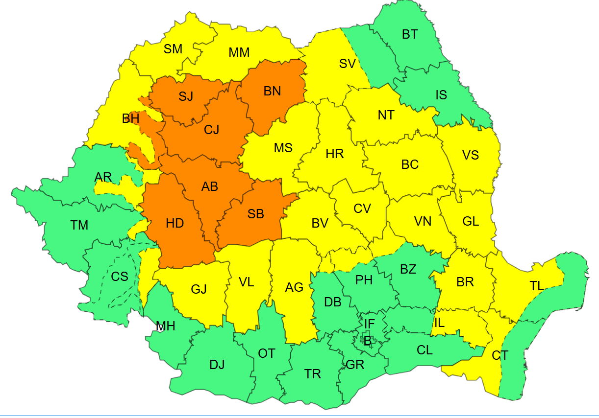 Pe lângă această avertizare, meteorologii au emis și un cod galben pentru mai multe regiuni ale țării, inclusiv nordul Crișanei, unde vor fi perioade cu instabilitate atmosferică, ploi abundente, vijelii și grindină de mici dimensiuni.