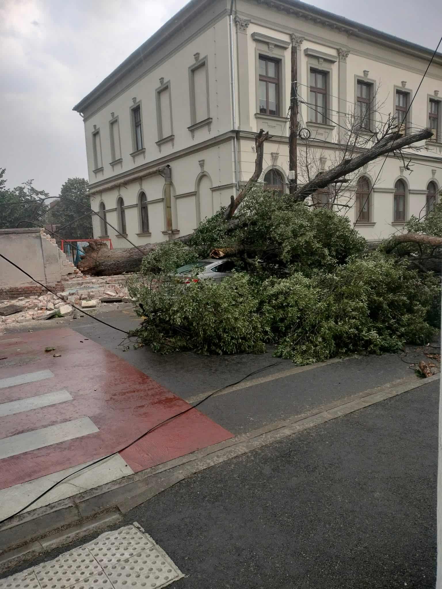 Din interiorul curții Colegiului Național „Mihai Eminescu” din Oradea, un copac a fost smuls în întregime și proiectat pe o mașină. Împreună cu arborele, și gardul unității de învățământ a fost avariat în mod serios.
