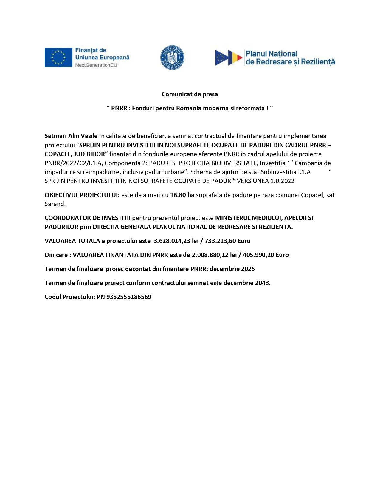 Satmari Alin Vasile in calitate de beneficiar, a semnat contractual de finantare pentru implementarea proiectului ”SPRIJIN PENTRU INVESTITII IN NOI SUPRAFETE OCUPATE DE PADURI DIN CADRUL PNRR – COPACEL, JUD BIHOR” finantat din fondurile europene aferente PNRR in cadrul apelului de proiecte PNRR/2022/C2/I.1.A, Componenta 2: PADURI SI PROTECTIA BIODIVERSITATII, Investitia 1” Campania de impadurire si reimpadurire, inclusiv paduri urbane”. Schema de ajutor de stat Subinvestitia I.1.A “ SPRIJIN PENTRU INVESTITII IN NOI SUPRAFETE OCUPATE DE PADURI” VERSIUNEA 1.0.2022