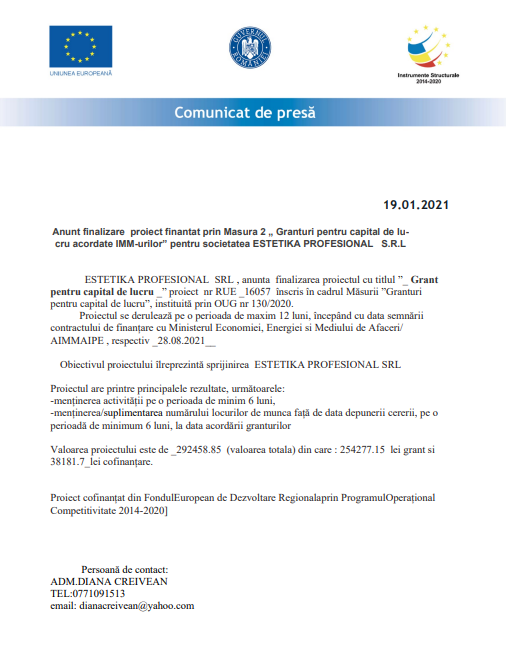 ESTETIKA PROFESIONAL SRL , anunta finalizarea proiectul cu titlul ”_ Grant pentru capital de lucru _” proiect nr RUE _16057 înscris în cadrul Măsurii ”Granturi pen-tru capital de lucru”, instituită prin OUG nr 130/2020.