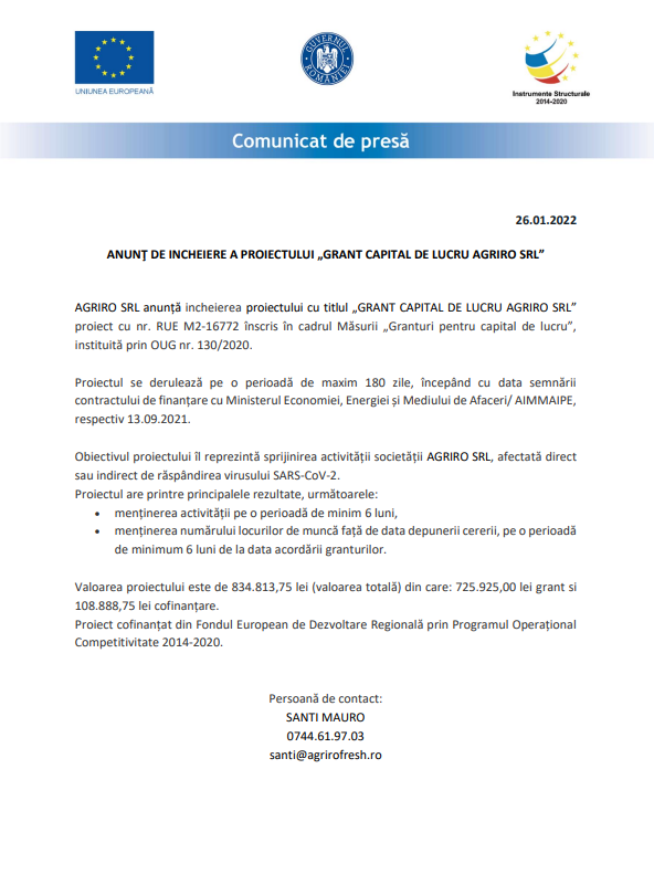 AGRIRO SRL anunță incheierea proiectului cu titlul „GRANT CAPITAL DE LUCRU AGRIRO SRL” proiect cu nr. RUE M2-16772 înscris în cadrul Măsurii „Granturi pentru capital de lucru”, insti-tuită prin OUG nr. 130/2020.