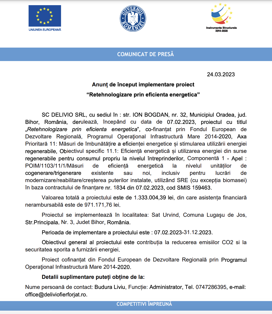 SC DELIVIO SRL, cu sediul în : str. ION BOGDAN, nr. 32, Municipiul Oradea, jud. Bihor, România, derulează, începând cu data de 07.02.2023, proiectul cu titlul „Retehnologizare prin eficienta energetica”, co-finanțat prin Fondul European de Dezvoltare Regională, Programul Operaţional Infrastructură Mare 2014-2020, Axa Prioritară 11: Măsuri de îmbunătățire a eficienței energetice și stimularea utilizării energiei regenerabile, Obiectivul specific 11.1: Eficiență energetică și utilizarea energiei din surse regenerabile pentru consumul propriu la nivelul întreprinderilor, Componentă 1 – Apel : POIM/1103/11/1/Măsuri de eficiență energetică la nivelul unităților de cogenerare/trigenerare existente sau noi, inclusiv pentru lucrări de modernizare/reabilitare/creșterea puterilor instalate, utilizând SRE (cu excepția biomasei) în baza contractului de finanțare nr. 1834 din 07.02.2023, cod SMIS 159463.