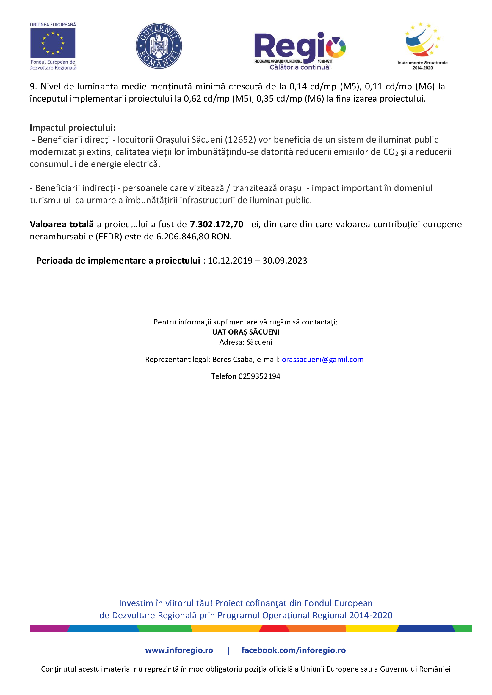 UAT Oraș Săcueni, în calitate de beneficiar al proiectului „EFICIENTIZAREA SISTEMULUI DE ILUMINAT PUBLIC A ORAȘULUI SĂCUENI”, COD SMIS 125280, conform contract 4951 din 10.12.2019 anunță finalizarea acestui proiect prin intermediul unei finanțări nerambursabile acordate prin Regio – Programul Operațional Regional 2014 – 2020, Axa prioritara 3 – Sprijinirea tranziției către o economie cu emisii scăzute de carbon, Prioritatea de investiție 3.1. Sprijinirea eficientei energetice, a gestionării inteligente a energiei și a utilizării energiei din surse regenerabile în infrastructurile publice, inclusiv în clădirele publice și în sectorul locuințelor.