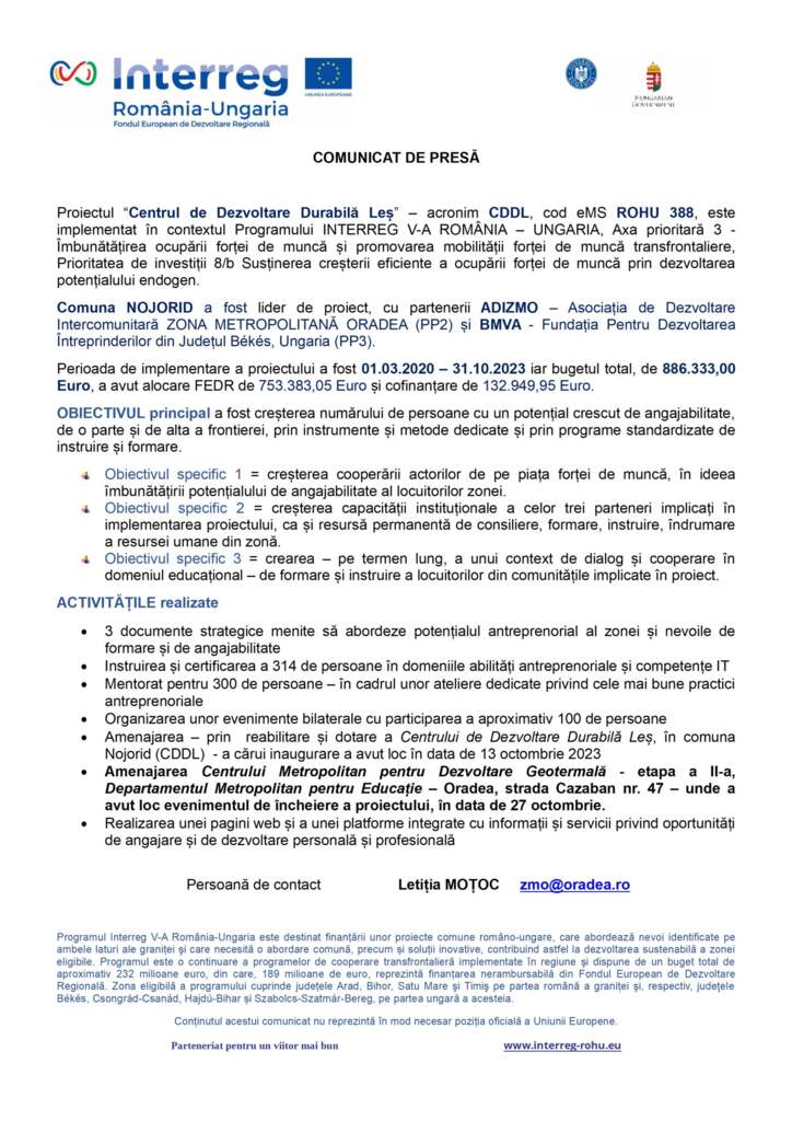 · Amenajarea – prin reabilitare și dotare a Centrului de Dezvoltare Durabilă Leș, în comuna Nojorid (CDDL) – a cărui inaugurare a avut loc în data de 13 octombrie 2023