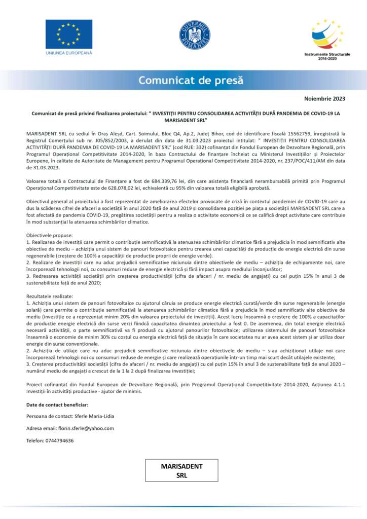MARISADENT SRL cu sediul în Oraș Aleșd, Cart. Șoimului, Bloc Q4, Ap.2, Județ Bihor, cod de identificare fiscală 15562759, înregistrată la Registrul Comerțului sub nr. J05/852/2003, a derulat din data de 31.03.2023 proiectul intitulat: ” INVESTIȚII PENTRU CONSOLIDAREA ACTIVITĂȚII DUPĂ PANDEMIA DE COVID-19 LA MARISADENT SRL” (cod RUE: 332) cofinanțat din Fondul European de Dezvoltare Regională, prin Programul Operațional Competitivitate 2014-2020, în baza Contractului de finanțare încheiat cu Ministerul Investițiilor și Proiectelor Europene, în calitate de Autoritate de Management pentru Programul Operațional Competitivitate 2014-2020, nr. 237/POC/411/AM din data de 31.03.2023.