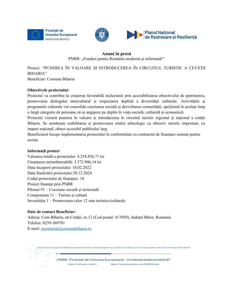 Proiect: “PUNEREA ÎN VALOARE ȘI INTRODUCEREA ÎN CIRCUITUL TURISTIC A CETĂȚII BIHARIA”