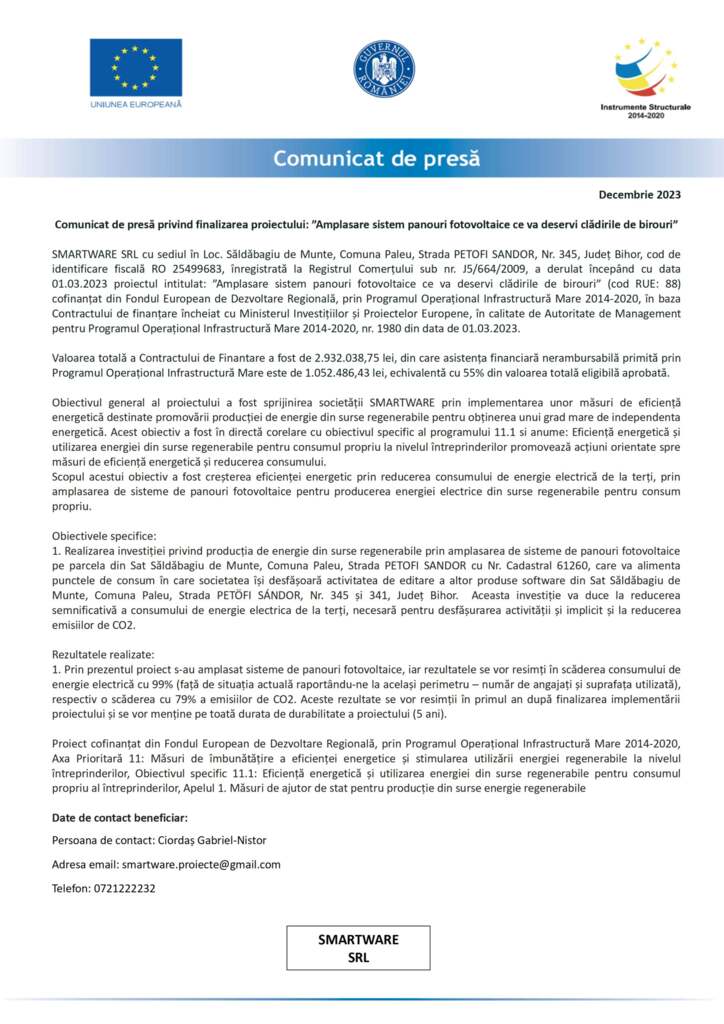 SMARTWARE SRL cu sediul în Loc. Săldăbagiu de Munte, Comuna Paleu, Strada PETOFI SANDOR, Nr. 345, Județ Bihor, cod de identificare fiscală RO 25499683, înregistrată la Registrul Comerțului sub nr. J5/664/2009, a derulat începând cu data 01.03.2023 proiectul intitulat: ”Amplasare sistem panouri fotovoltaice ce va deservi clădirile de birouri” (cod RUE: 88) cofinanțat din Fondul European de Dezvoltare Regională, prin Programul Operațional Infrastructură Mare 2014-2020, în baza Contractului de finanțare încheiat cu Ministerul Investițiilor și Proiectelor Europene, în calitate de Autoritate de Management pentru Programul Operațional Infrastructură Mare 2014-2020, nr. 1980 din data de 01.03.2023.