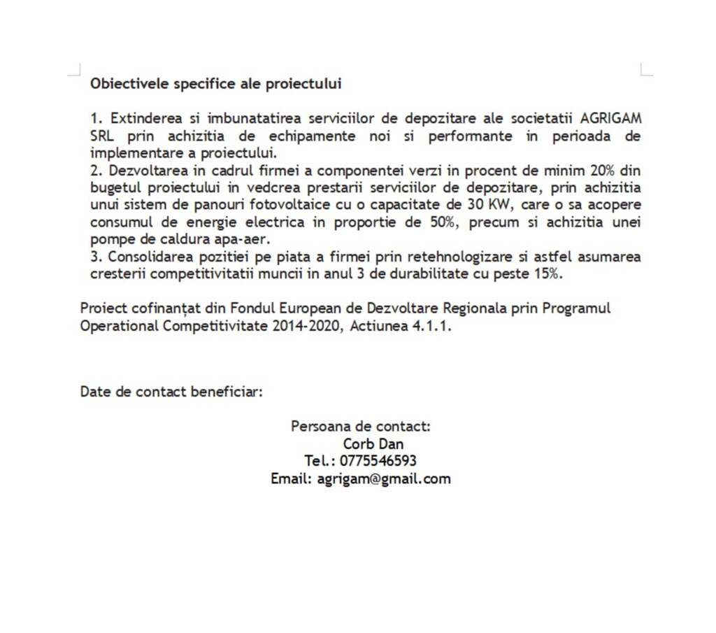 1. Extinderea si imbunatatirea serviciilor de depozitare ale societatii AGRIGAM SRL prin achizitia de echipamente noi si performante in perioada de implementa-re a proiectului.