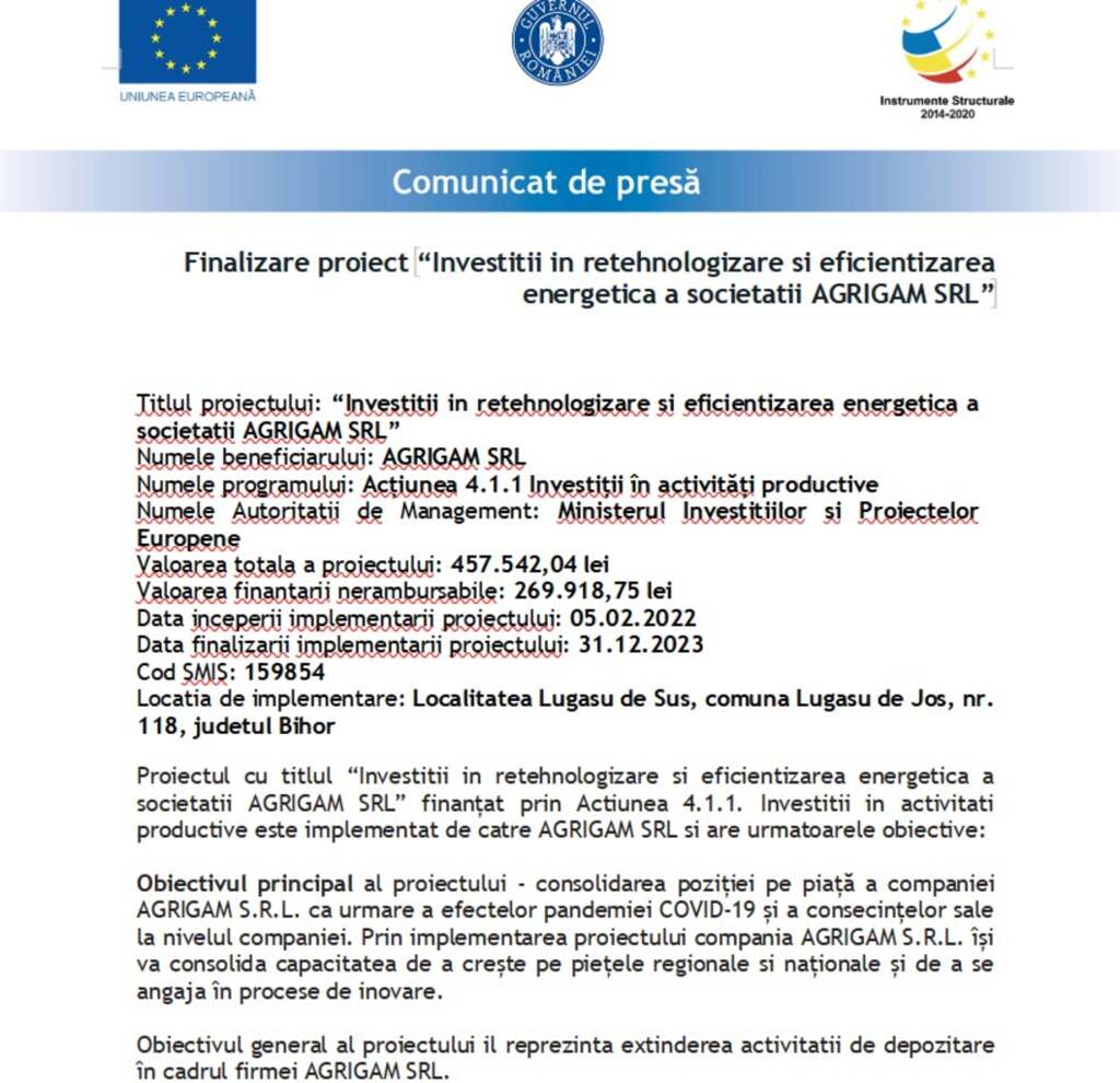 Finalizare proiect “Investitii in retehnologizare si eficientiza-rea energetica a societatii AGRIGAM SRL”