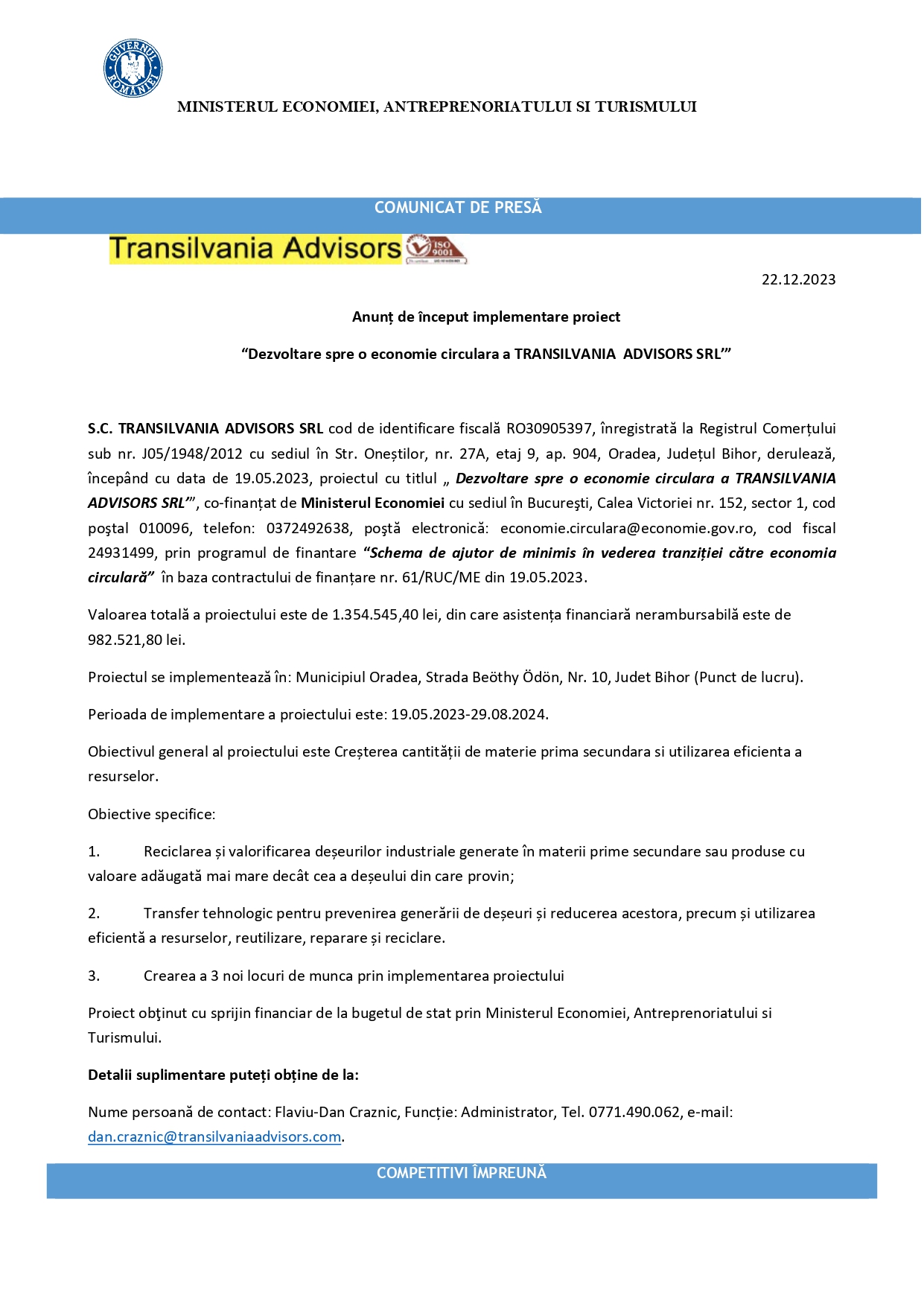S.C. TRANSILVANIA ADVISORS SRL cod de identificare fiscală RO30905397, înregistrată la Registrul Comerțului sub nr. J05/1948/2012 cu sediul în Str. Oneștilor, nr. 27A, etaj 9, ap. 904, Oradea, Județul Bihor, derulează, începând cu data de 19.05.2023, proiectul cu titlul „ Dezvoltare spre o economie circulara a TRANSILVANIA ADVISORS SRL’”, co-finanțat de Ministerul Economiei cu sediul în Bucureşti, Calea Victoriei nr. 152, sector 1, cod poştal 010096, telefon: 0372492638, poştă electronică: economie.circulara@economie.gov.ro, cod fiscal 24931499, prin programul de finantare “Schema de ajutor de minimis în vederea tranziției către economia circulară” în baza contractului de finanțare nr. 61/RUC/ME din 19.05.2023.