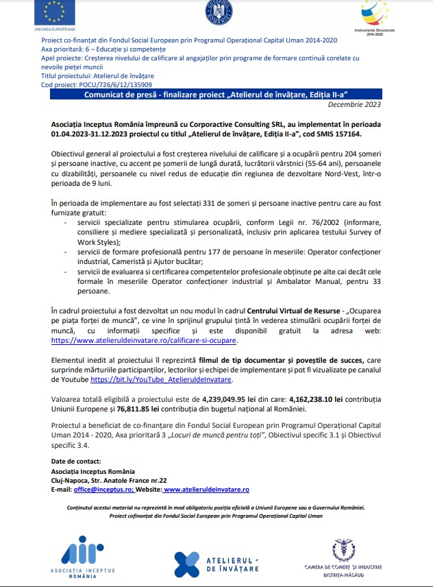 Comunicat de presă – finalizare proiect „Atelierul de învățare, Ediția II-a” Decembrie 2023