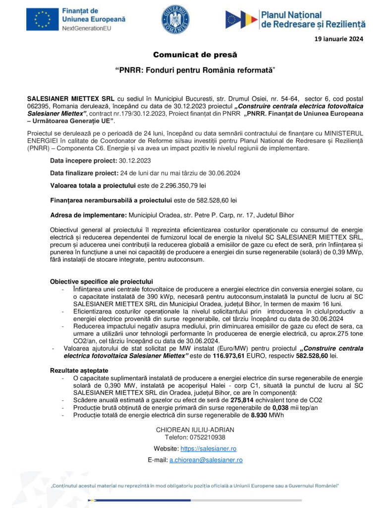 SALESIANER MIETTEX SRL cu sediul în Municipiul Bucuresti, str. Drumul Osiei, nr. 54-64, sector 6, cod postal 062395, Romania derulează, începând cu data de 30.12.2023 proiectul „Construire centrala electrica fotovoltaica Salesianer Miettex”, contract nr.179/30.12.2023, Proiect finanțat din PNRR „PNRR. Finanțat de Uniunea Europeana – Următoarea Generație UE”.
