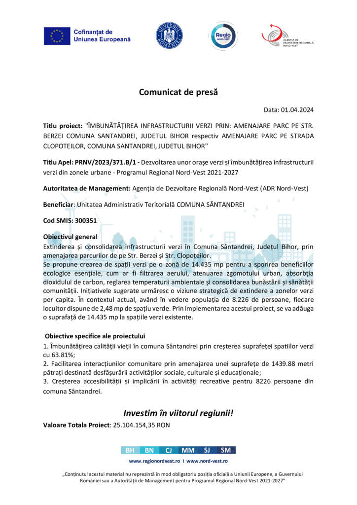 Titlu proiect: “ÎMBUNĂTĂȚIREA INFRASTRUCTURII VERZI PRIN: AMENAJARE PARC PE STR. BERZEI COMUNA SANTANDREI, JUDETUL BIHOR respectiv AMENAJARE PARC PE STRADA CLOPOTEILOR, COMUNA SANTANDREI, JUDETUL BIHOR”